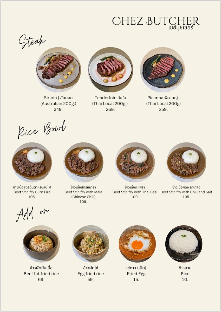เชย์บุชเชอร์ - Chez Butcher is a charming, intimate steakhouse located in the heart of Chiang Mai. The menu, though deliberately small, focuses on expertly cooked beef and steak dishes that deliver bold, memorable flavors. Highlights include the perfectly seared sirloin and the tender strip steak, both praised for their juicy texture and rich taste. Alongside these, signature sides like the beef fat rice topped with a fried egg and the refreshing tomato salad with Japanese sesame dressing elevate the meal experience.